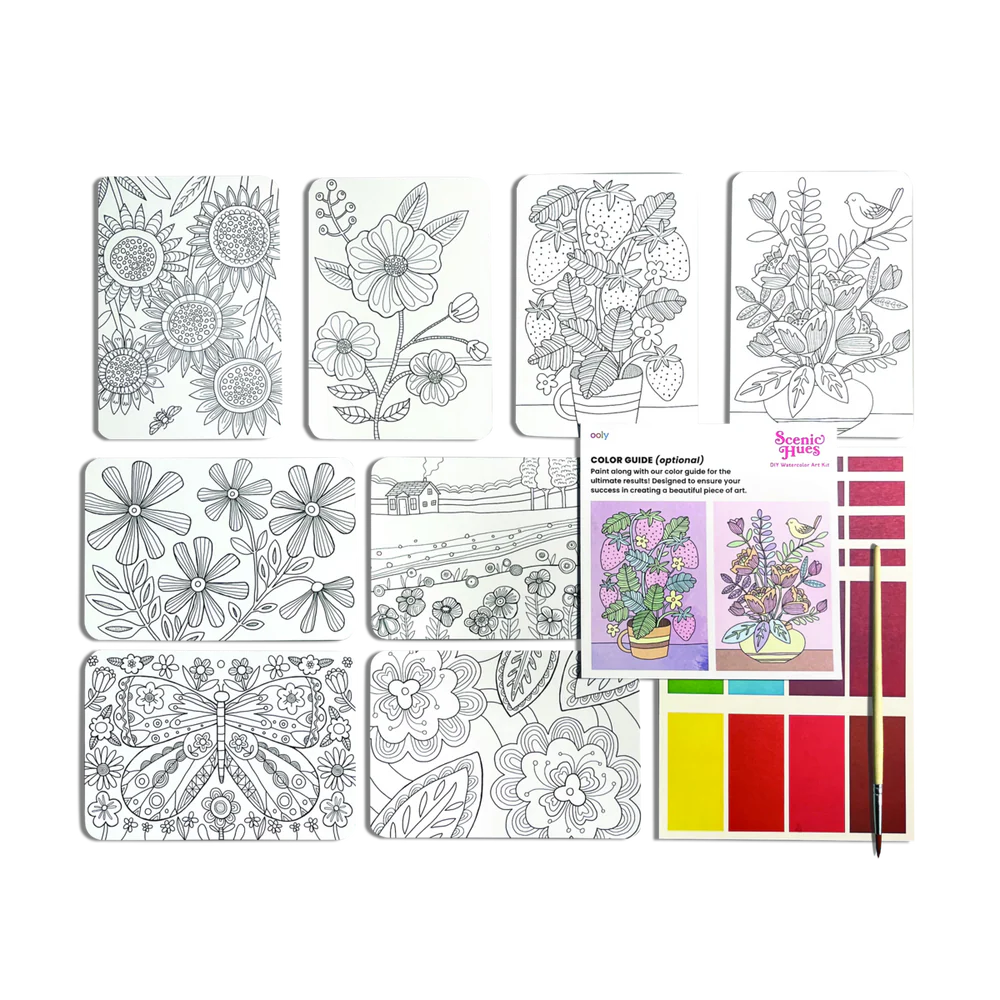 - Kit includes 8 different watercolor postcards, 8 paint palettes, 1 paint brush, and a color guide