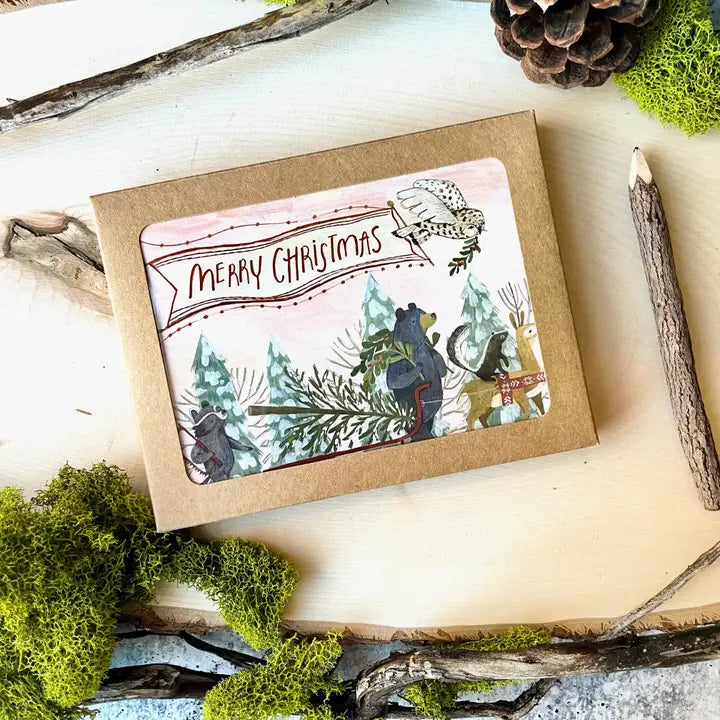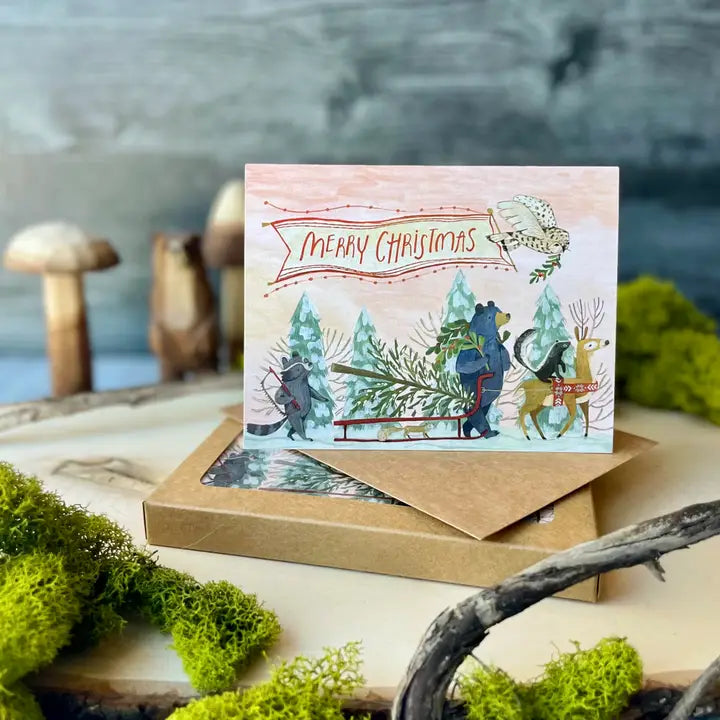 Six Merry Christmas Tree Cutting Cards as a boxed set.