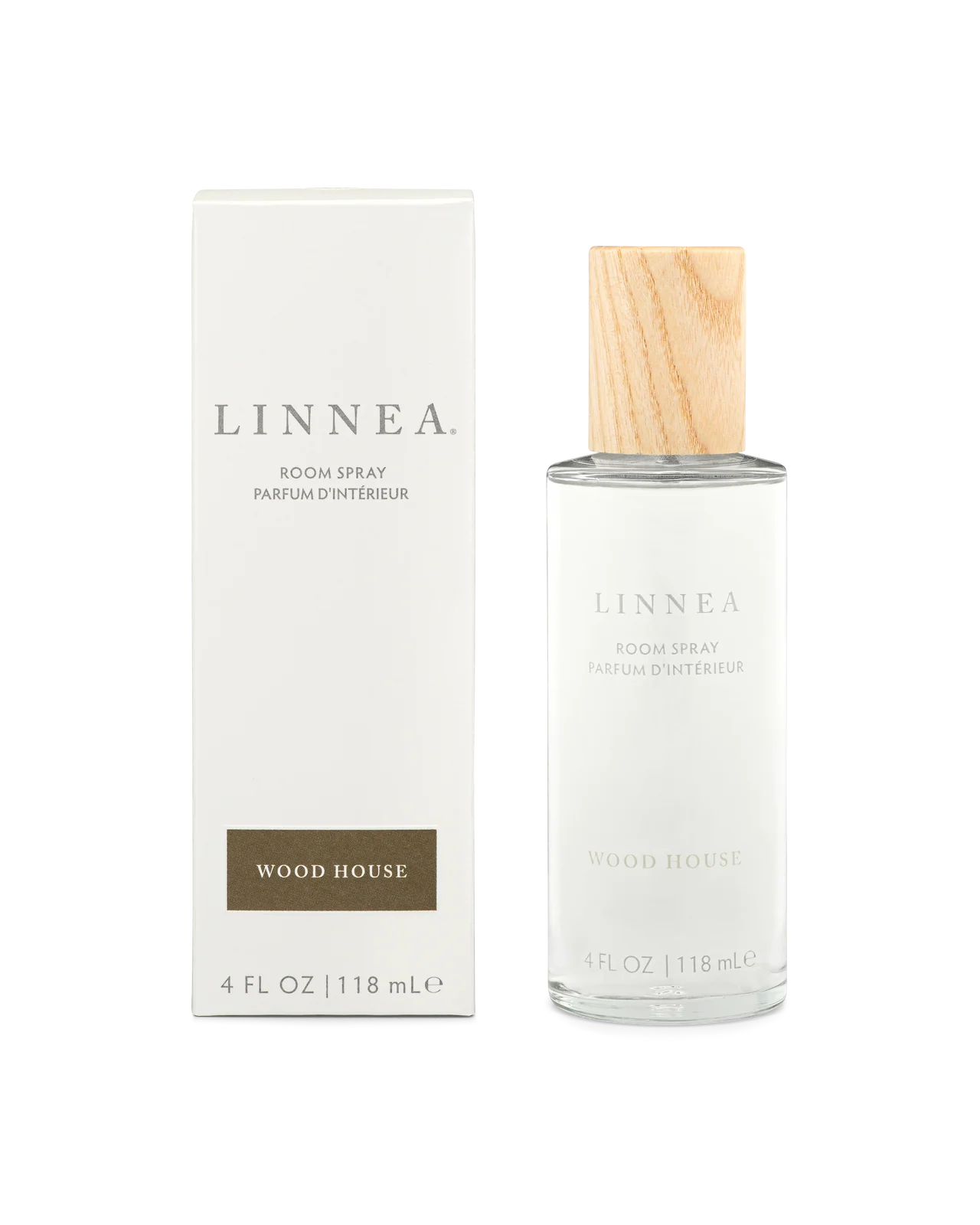 ROOM SPRAY A quiet moment, bottled. The Wood House Room Spray fills your space with violet, bergamot, and sandalwood for a refined, comforting calm. Housed in a white textured embossed carton with a natural wood stopper, it neutralizes odors with advanced technology and lingers like a breath of stillness.