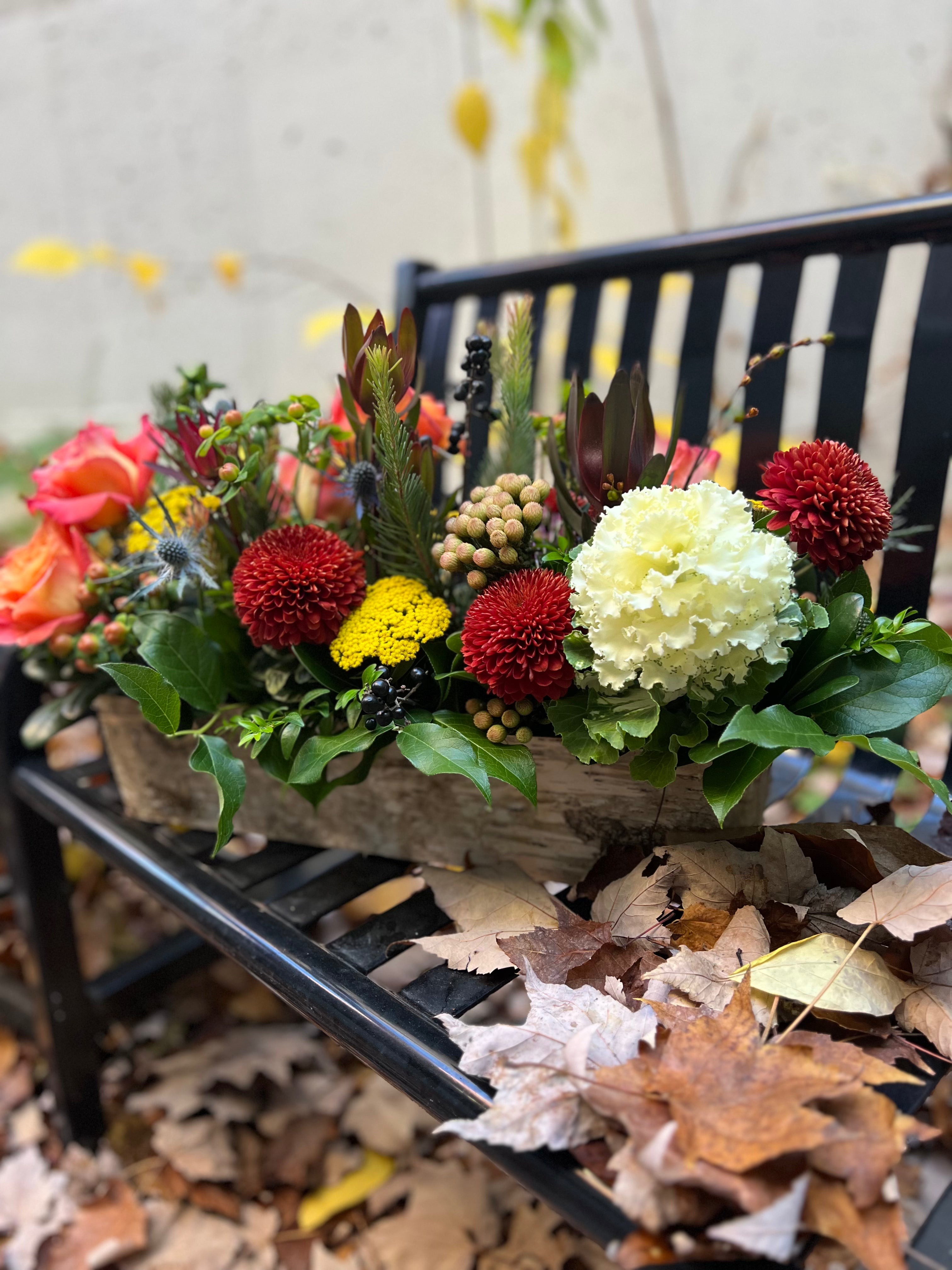 This beautiful table arrangement makes a lovely centerpiece for a Thanksgiving table. The flowers may not be exact as in the photo, but it will be a full, lush, late fall arrangement, carrying you right into the Holiday season. The vessel itself is wrapped in birchwood and measures 18inches long x 4 inches wide x 4 inches high.