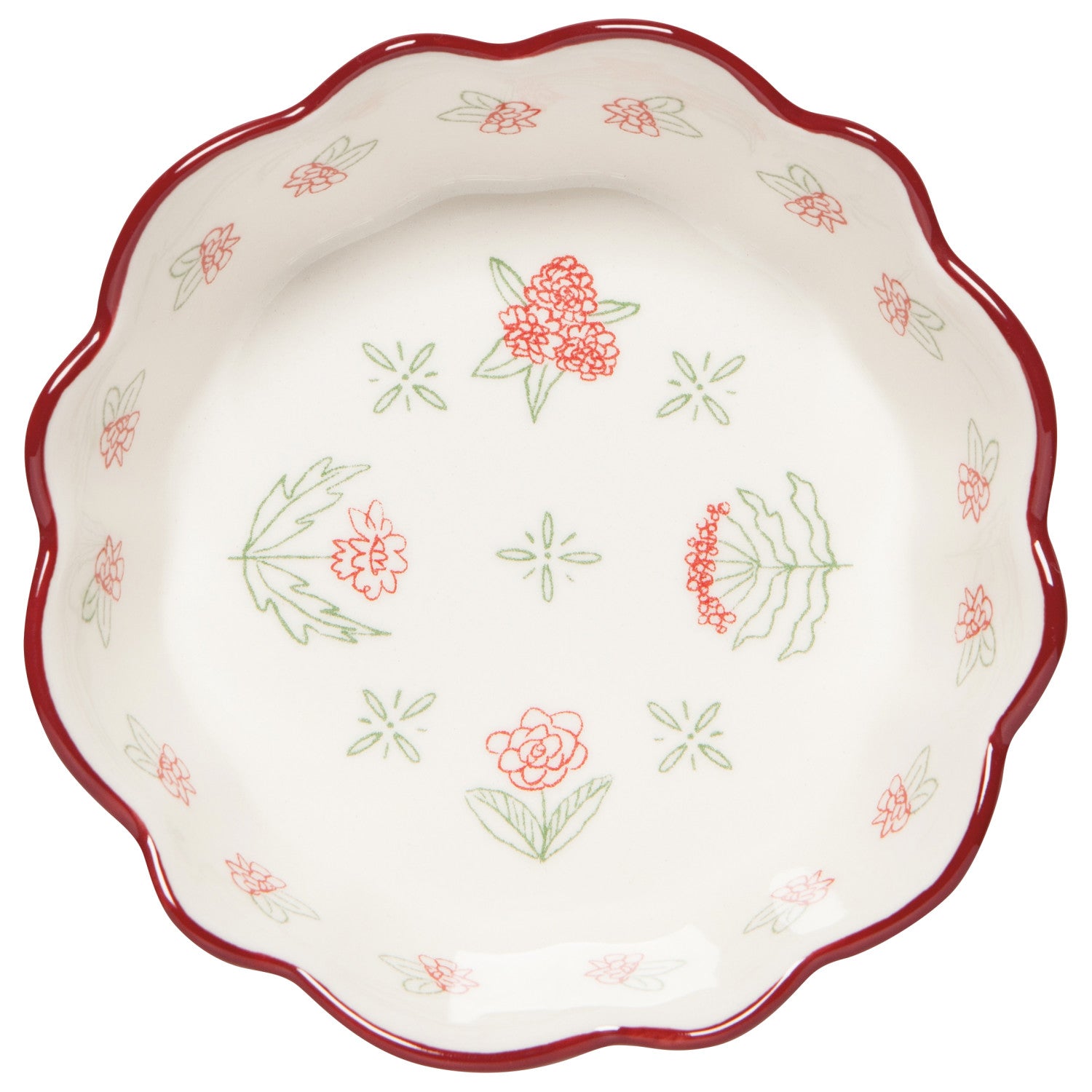 Delicate flowers in a quaint palette of sage green, wine red and bright white exude rustic farmhouse charm with these Camellia Stamped bowls.