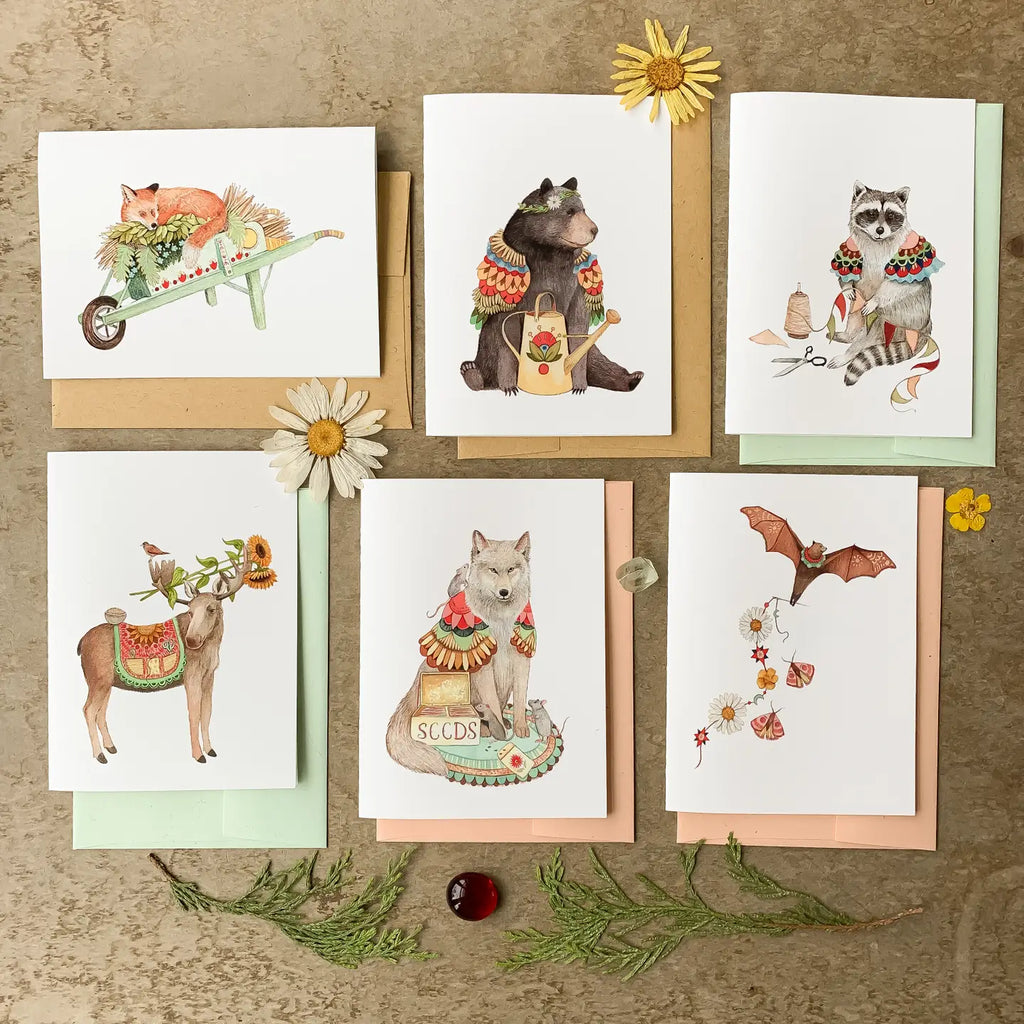 Each card pack comes with 6 different cards with matching envelopes in a clear little box! Each card is approximately 4.75”x3.5” (A1). Printed and designed in Vermont.