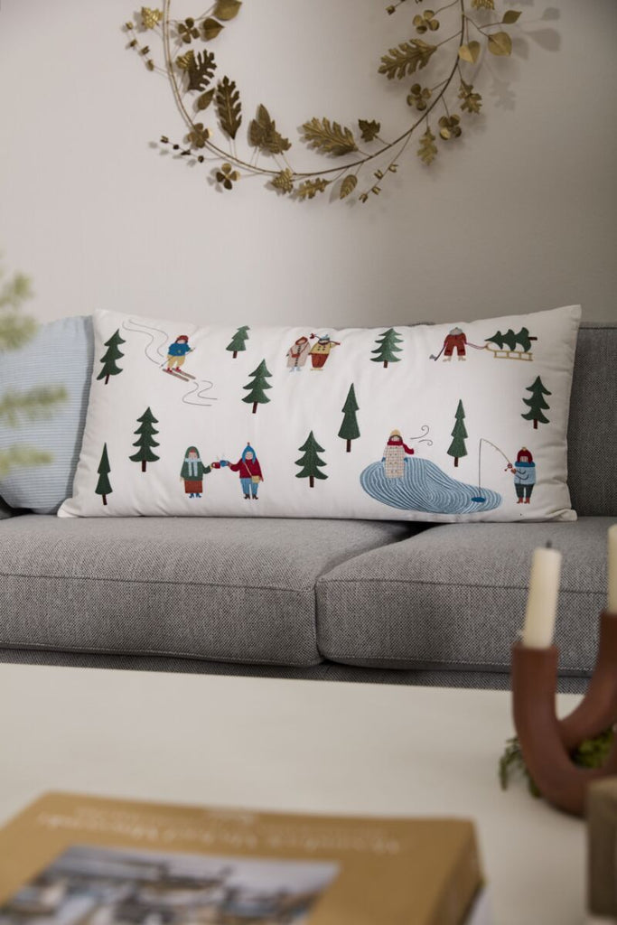 Take a closer look at the charming alpine village scene on this pillow & notice the whimsical details that add a seasonal touch to home decor. The rectangular Villagers Pillow features an in-house custom screen-printed design on a white cotton velvet background with a playful embroidered scene & rich color palette of villagers doing their favorite winter activities in cozy hats & scarves. An insert is included with a zipper back opening (spot cleaning recommended for the cover). Arrange with the Villagers Pot & Vase for a festive, coordinated look.