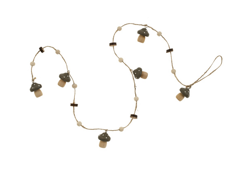 The wooden Mushroom Garland showcases cute mushrooms and wooden beads on a jute string. Use them to add fairy tale charm and whimsical autumnal feel to your space.