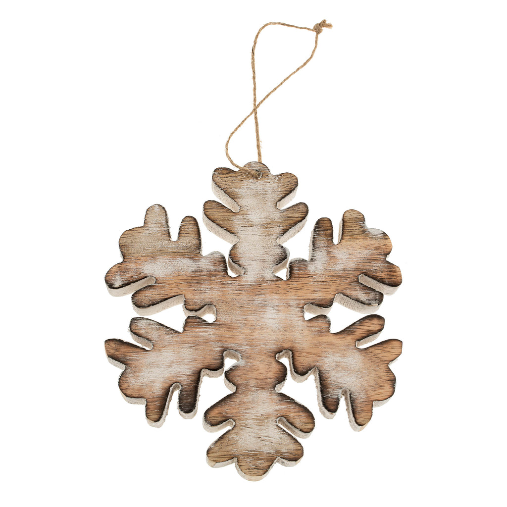 The Wooden Snowflake Ornament in Whitewash is crafted from sustainably sourced mango wood with a rustic finish. Its classic snowflake shape adds a timeless touch to Christmas decor, perfect to hang on holiday trees, shelves, or gift wrapping.